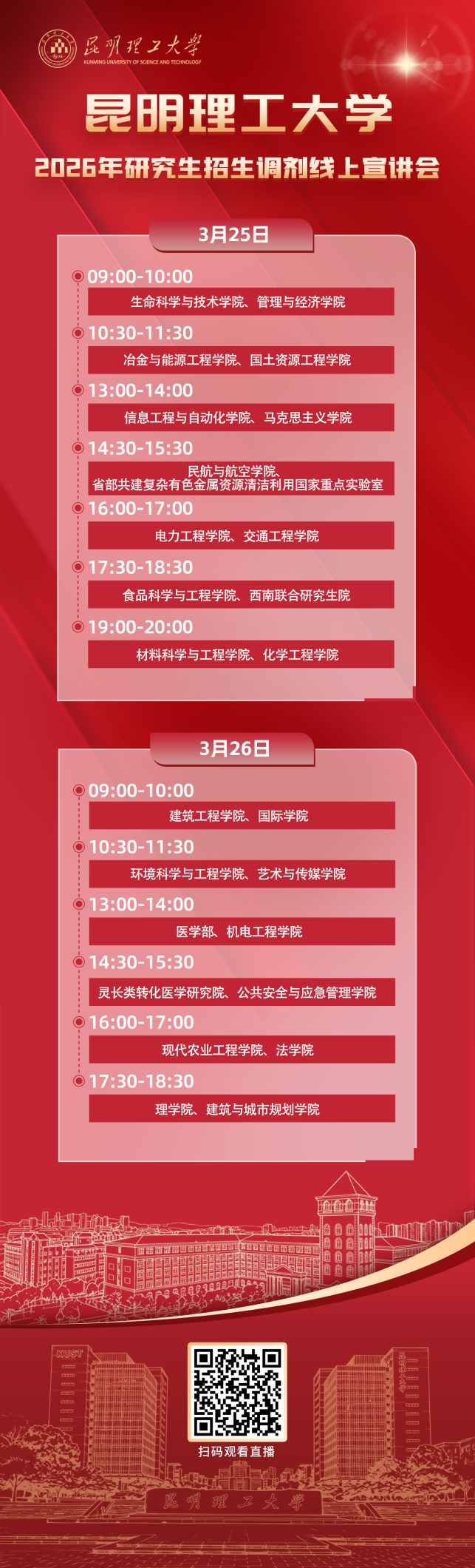 昆明理工大学2026年硕士研究生招生调剂线上宣讲会将于2026年3月25日—26日进行,带你全方位了解学校相关招生政策、调剂要求、学科发展及专业、导师信息,欢迎各位考生观看直播!