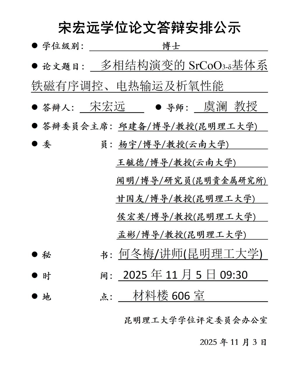 宋宏远学位论文答辩安排公示