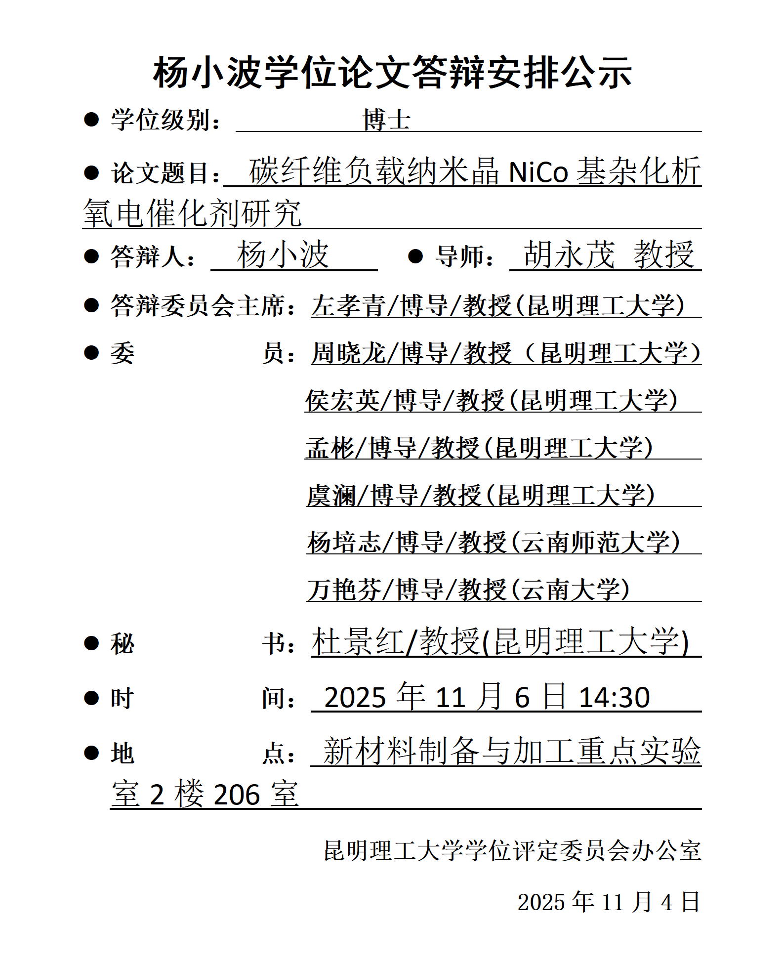 杨小波学位论文答辩安排公示